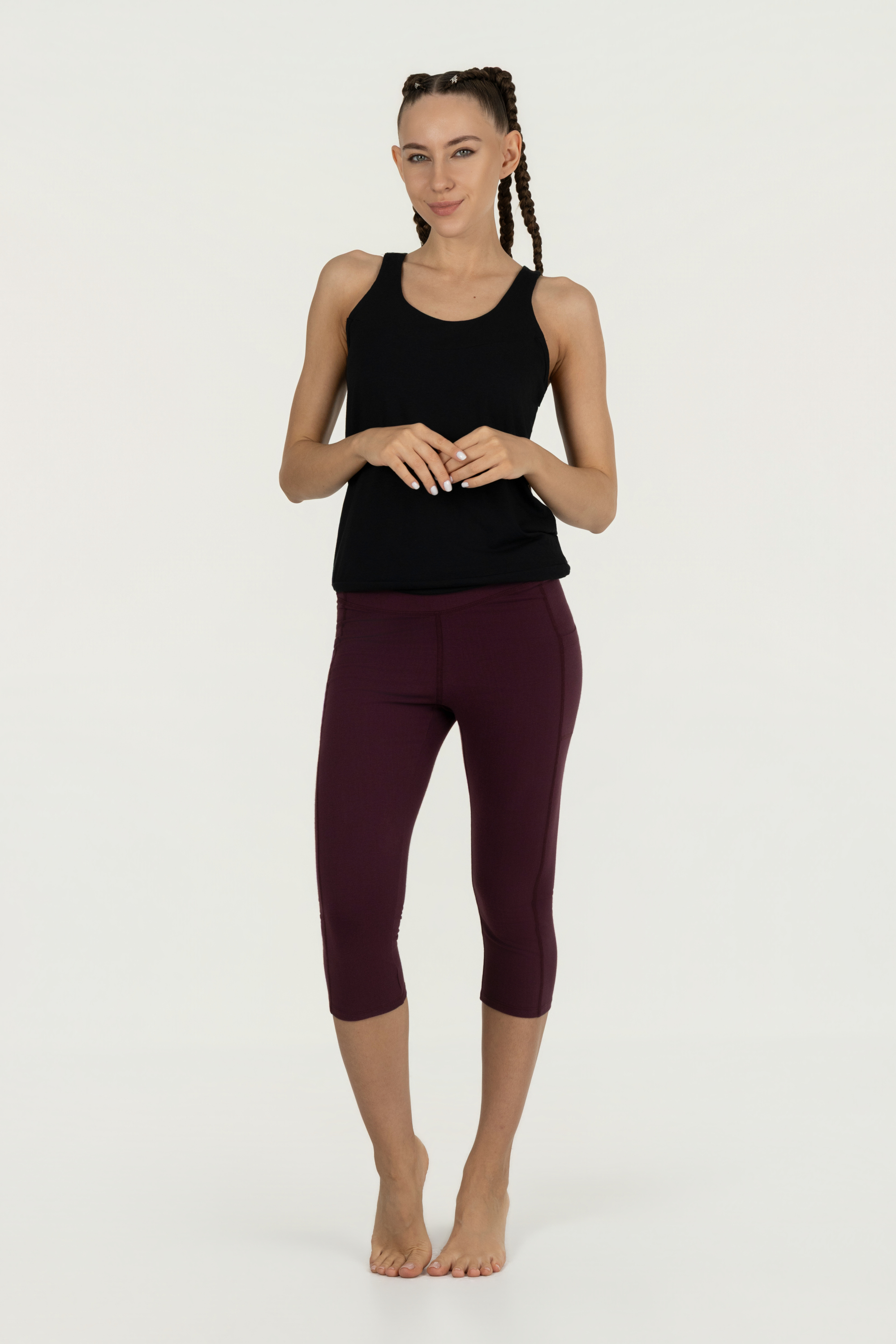 Tara capri yogaleggings har en flatterende høy linning som skånsomt støtter kjernemuskulaturen og holder seg komfortabelt på plass når du beveger deg. Den brede linningen gir en sikker passform uten å føles begrensende, slik at du kan bevege deg fritt i hver stilling.