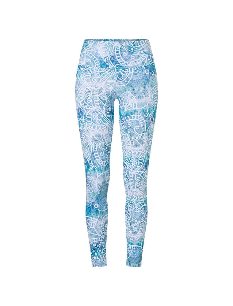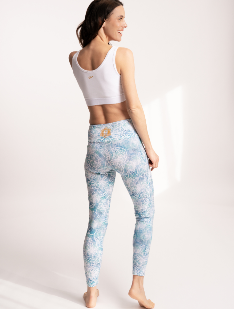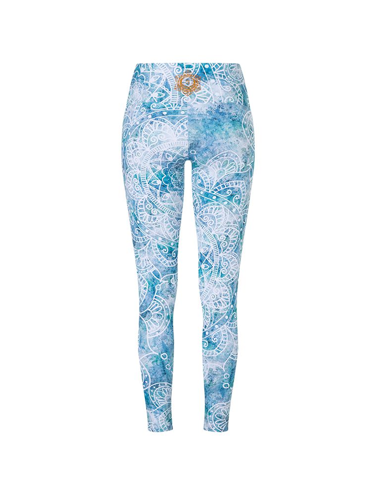 Yogaleggingsene «Caru» har en tettsittende passform med smale ben og en høy linning. De sitter godt og komfortabelt, slik at du kan bevege deg fritt. Mandalamønsteret er designet som et heldekkende trykk og gir leggingsene deres særegne utseende: detaljert, flagrende og rolig. I fargen Isblå føles designet klart og lett – friskt, feminint og herlig harmonisk.