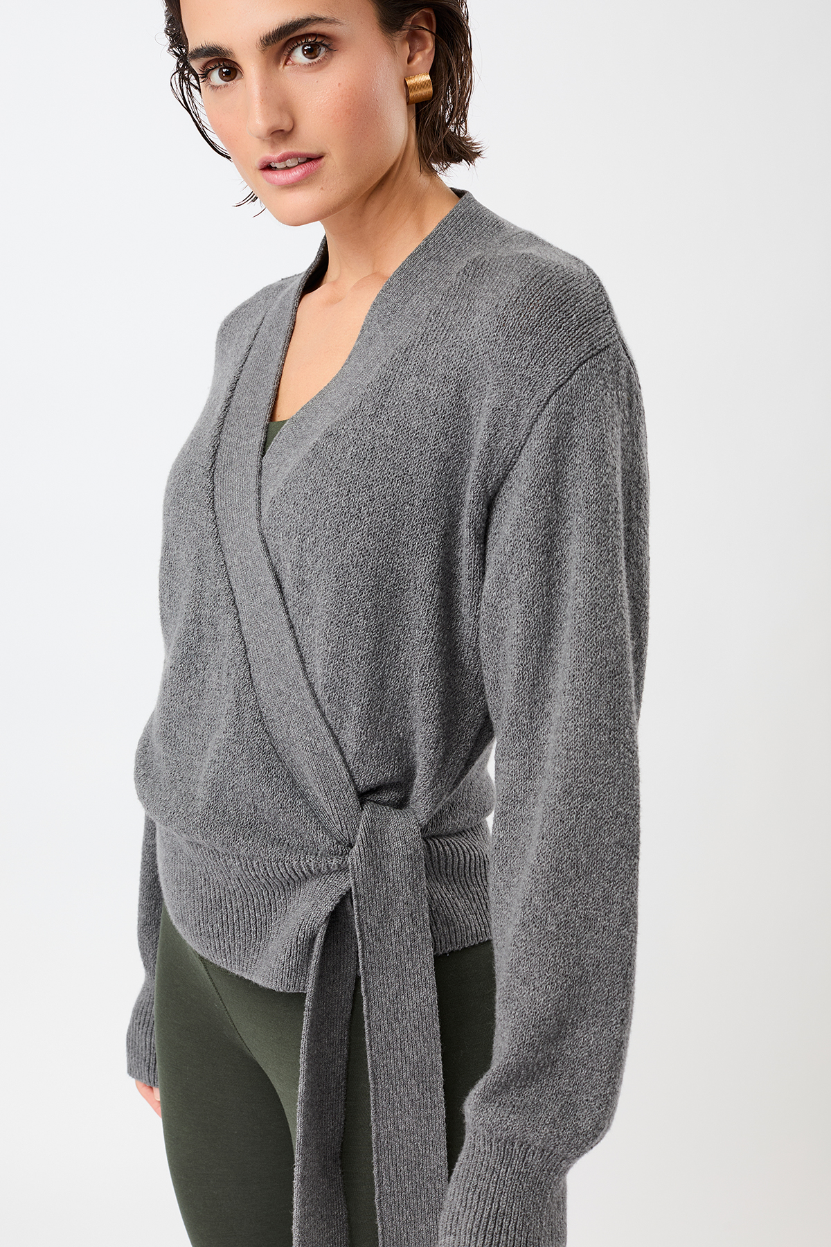 Feel Good Cardigan fra Mandala er en omslagsjakke i myk strikk med skjult trykknapp og bred bånd som knytes i midjen.