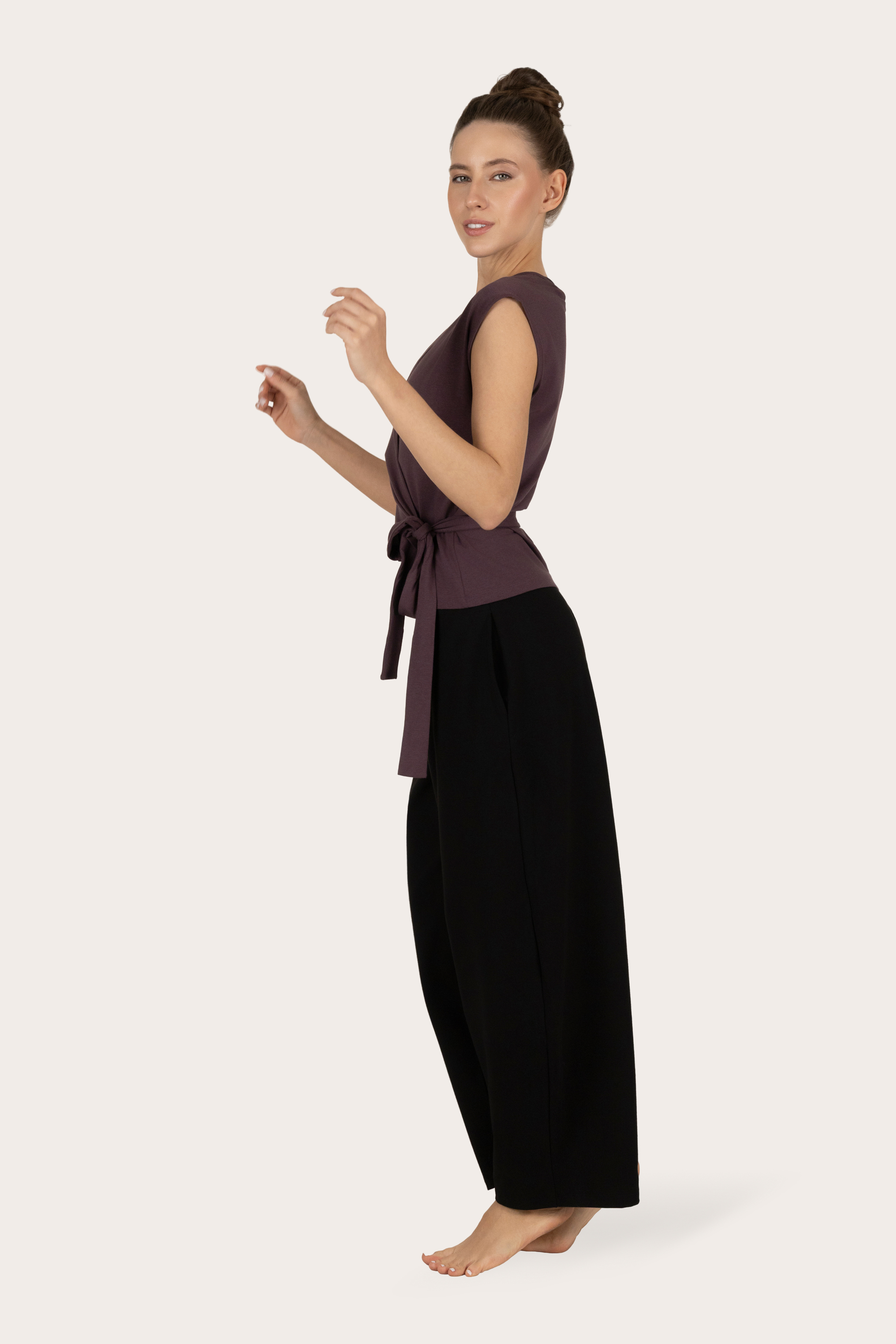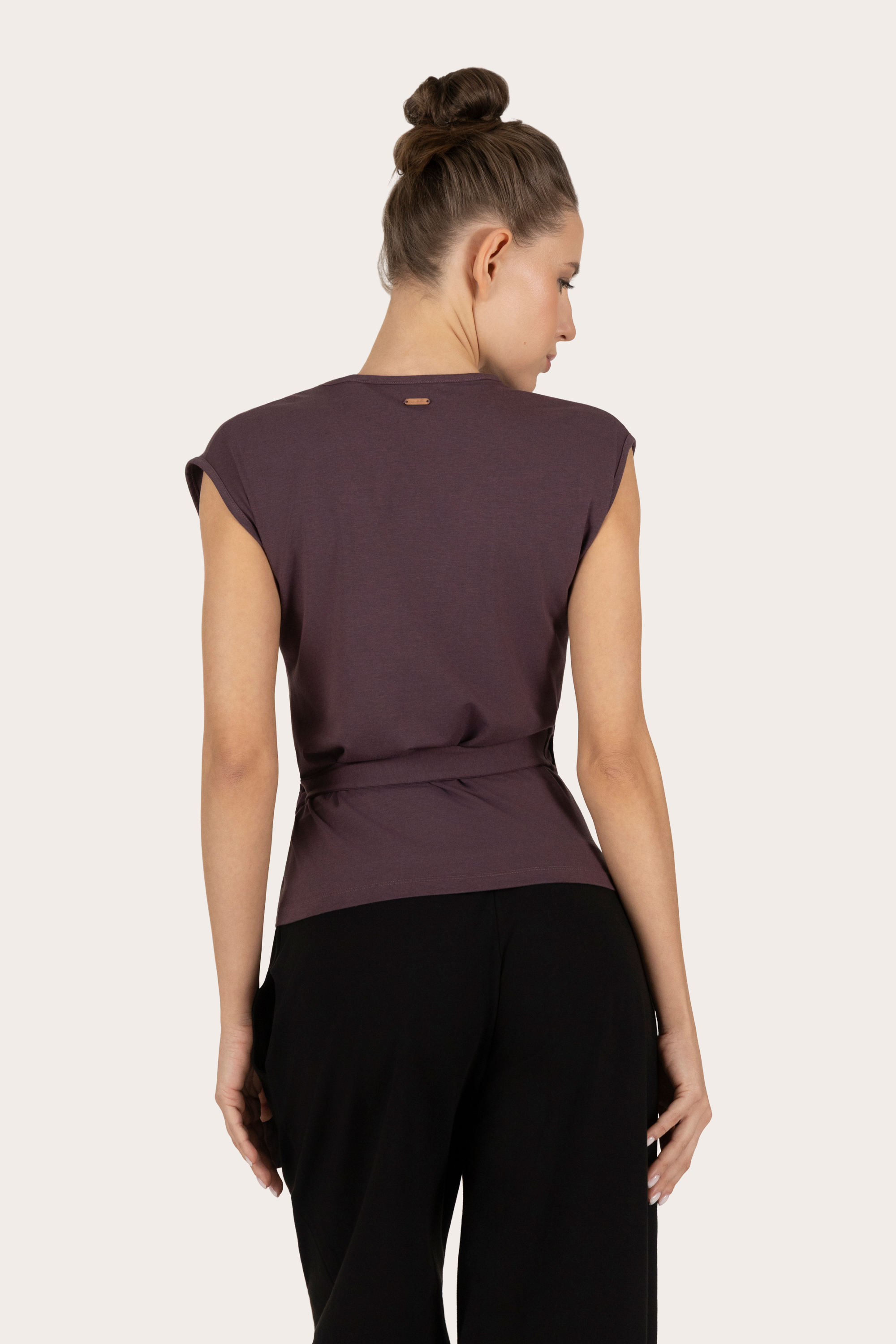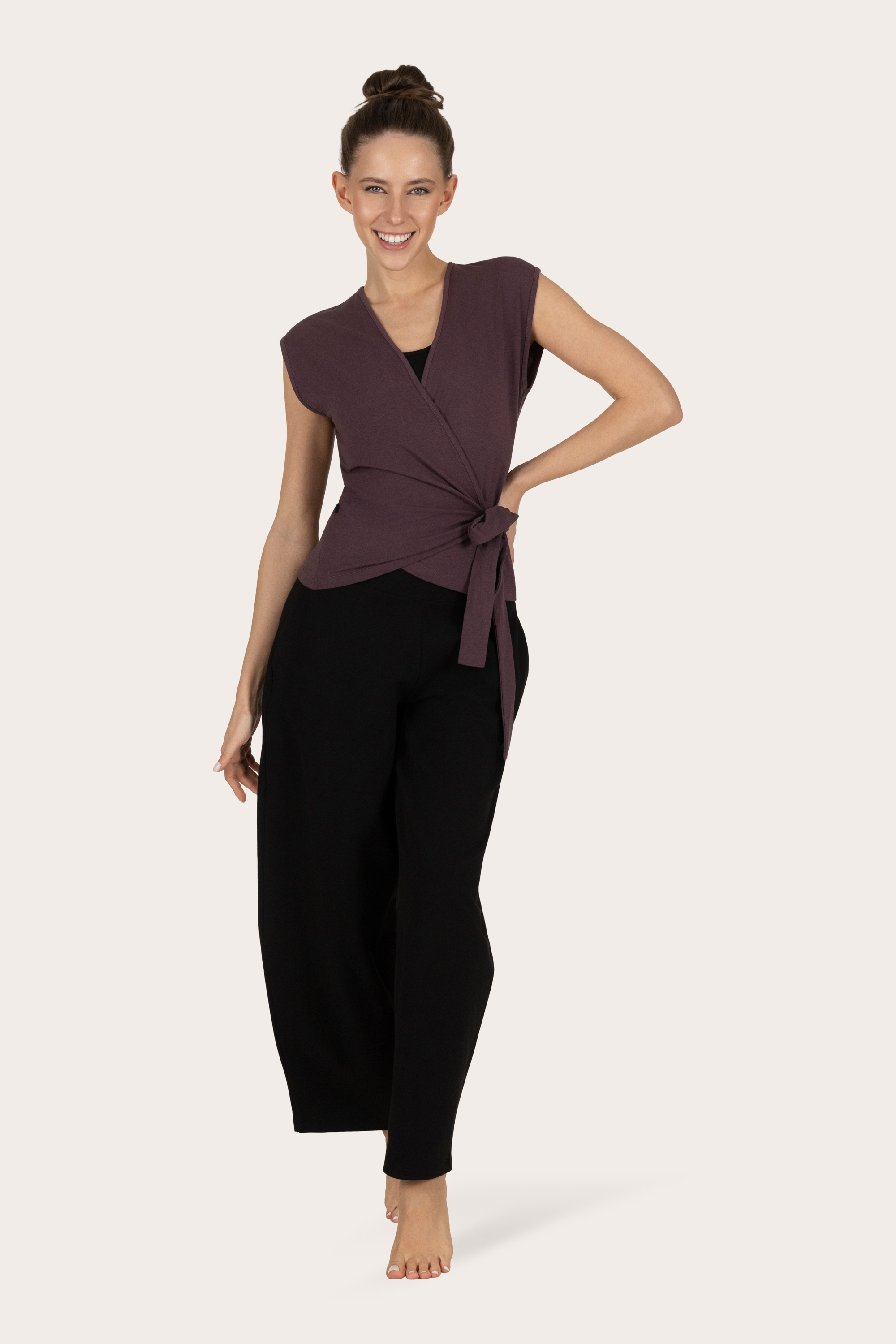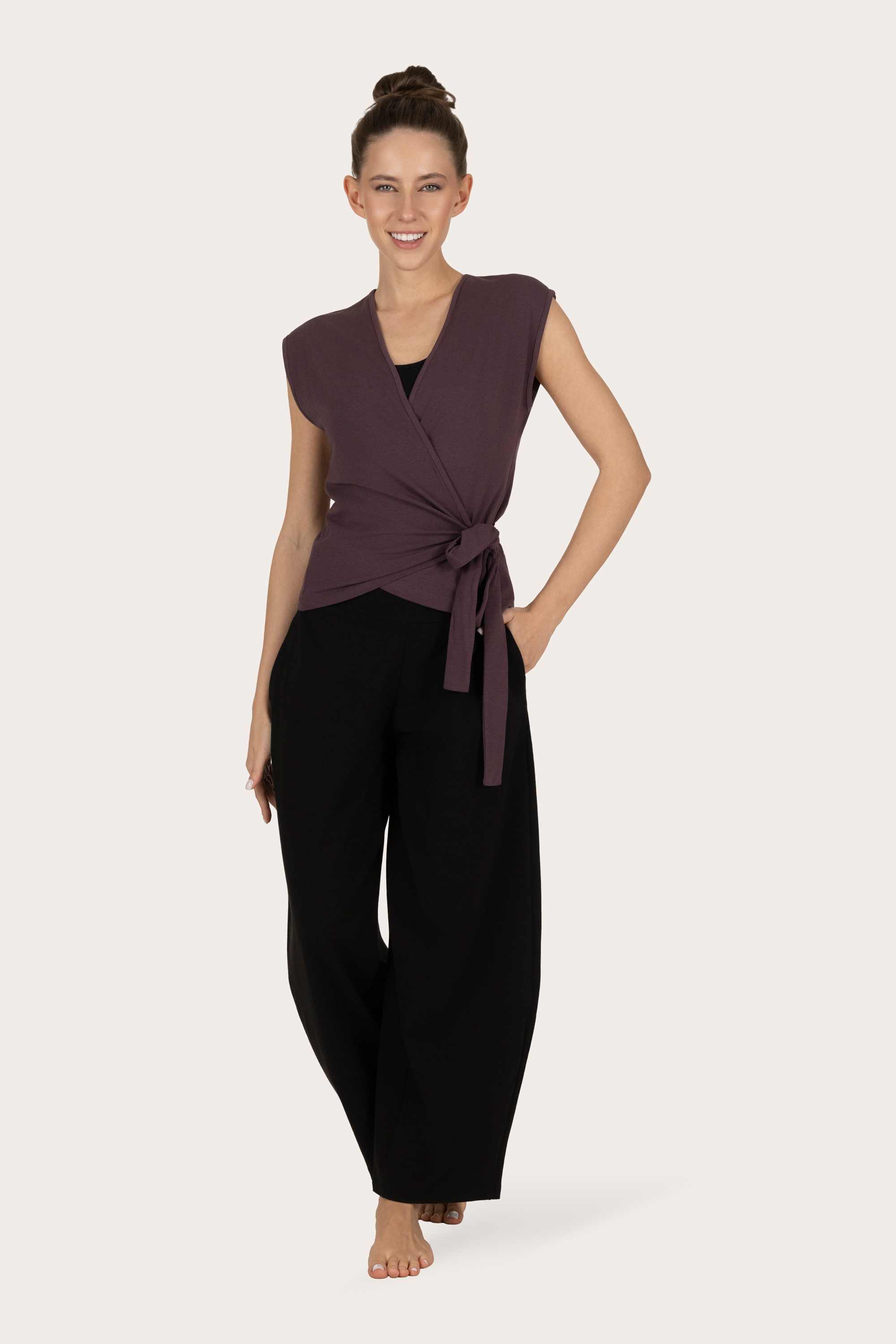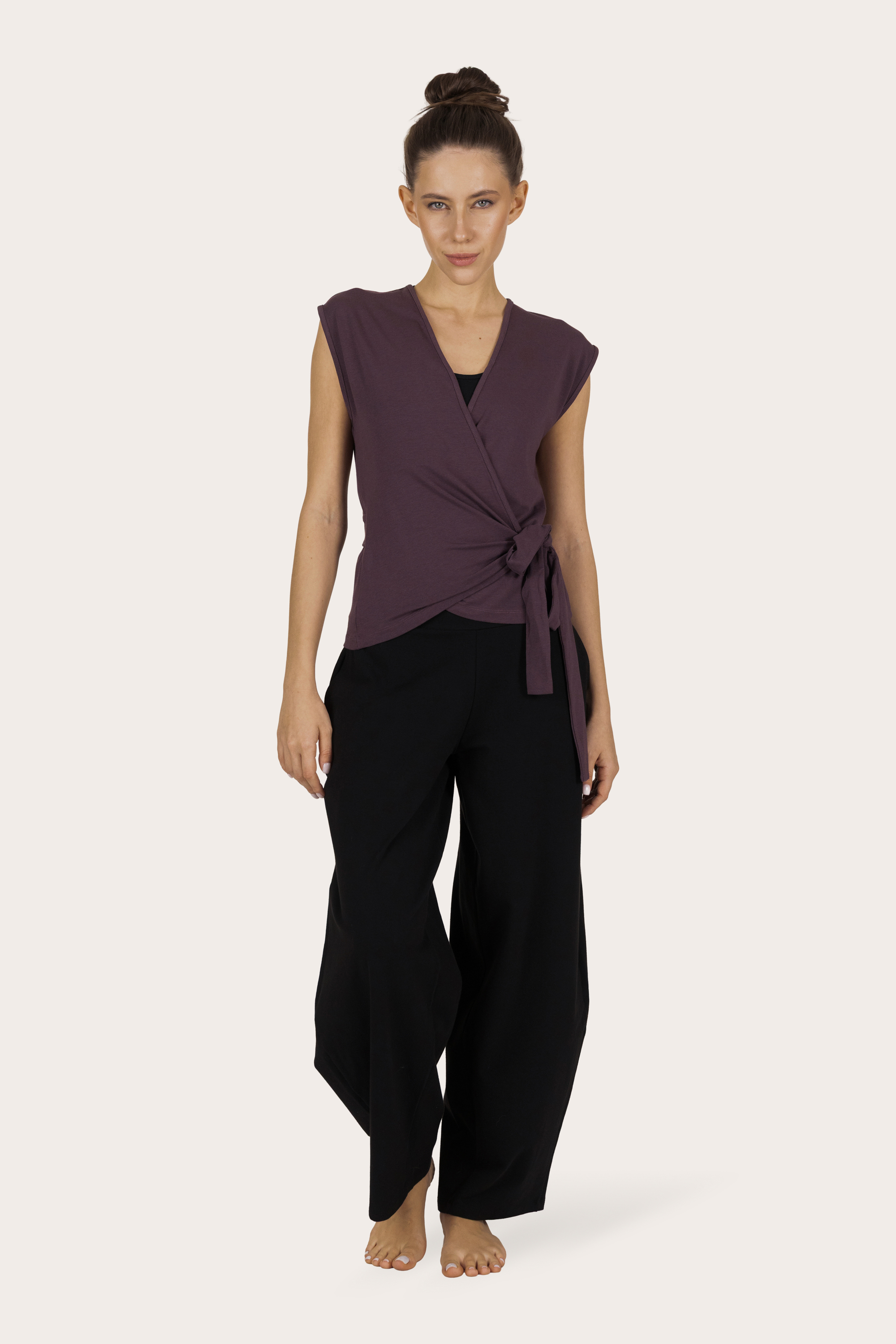 Toppen kommer fra Urban Goddess yogaklær. De bruker kun sertifisert økologisk bomull i sin produksjon. I tillegg er bambusen i denne yogatoppen Oekotex STeP-sertifisert, som er den høyeste lukkede sløyfen miljøvennlige og sikre varianten av bambus.