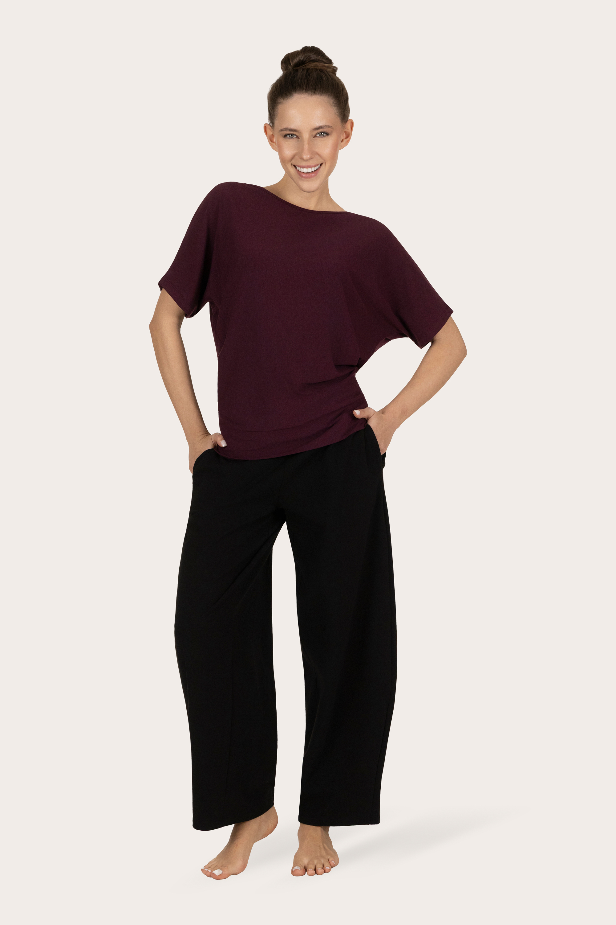 Den har vide ermer, så du har full bevegelsesfrihet, den er romslig, men samtidig har den et stramt midjebånd, som gjør at den sitter på plass under din yogaprakis.