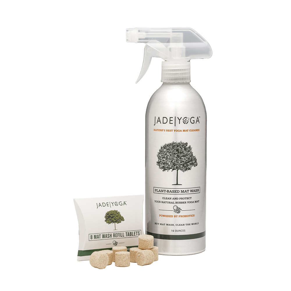 Jades plantebaserte mattevask er laget spesielt for yogamatter i naturgummi og inneholder en utvalgt blanding av essensielle oljer som ikke bare rengjør matten din, men også inneholder antioksidanter som bidrar til å forlenge levetiden til matten.