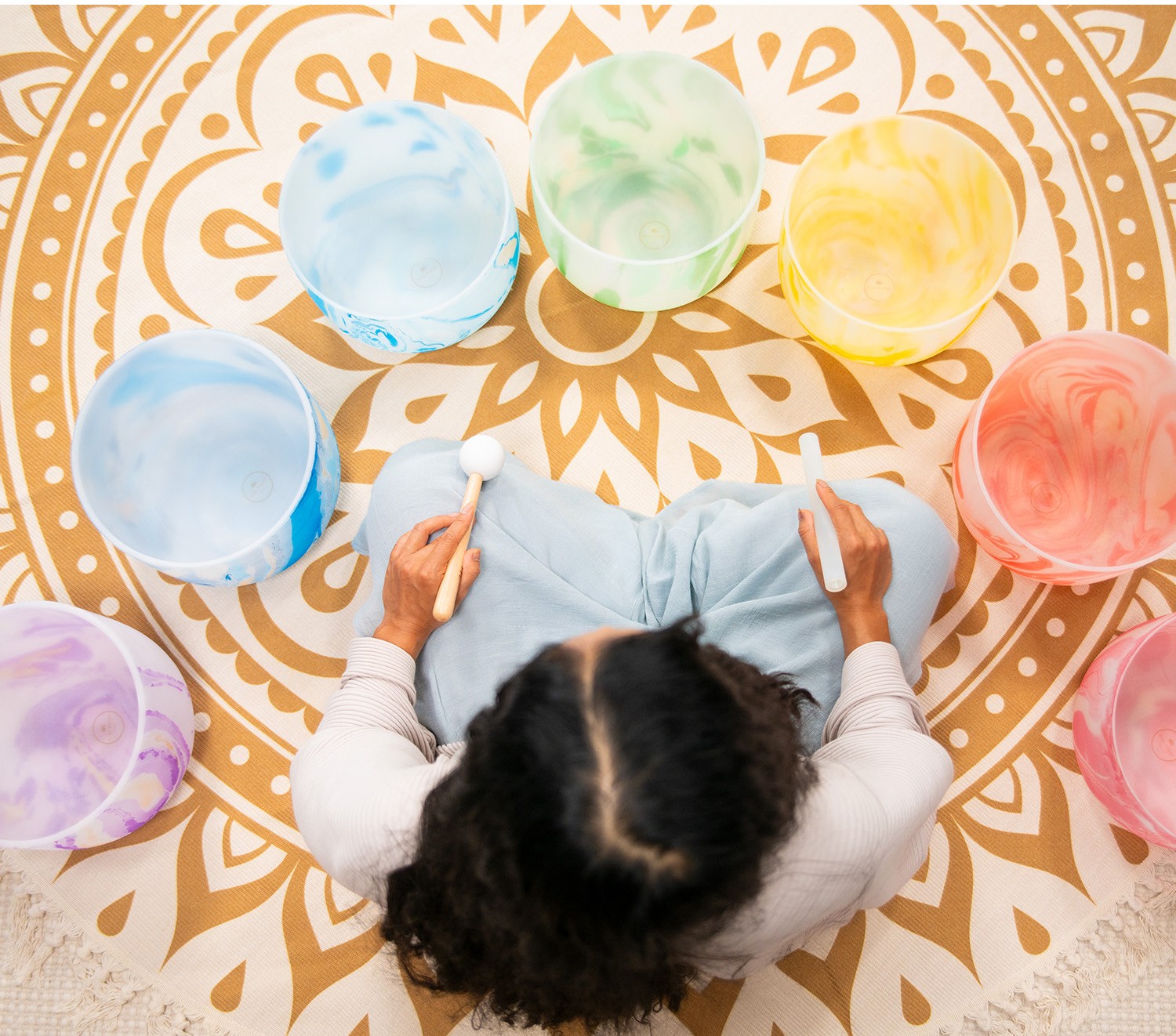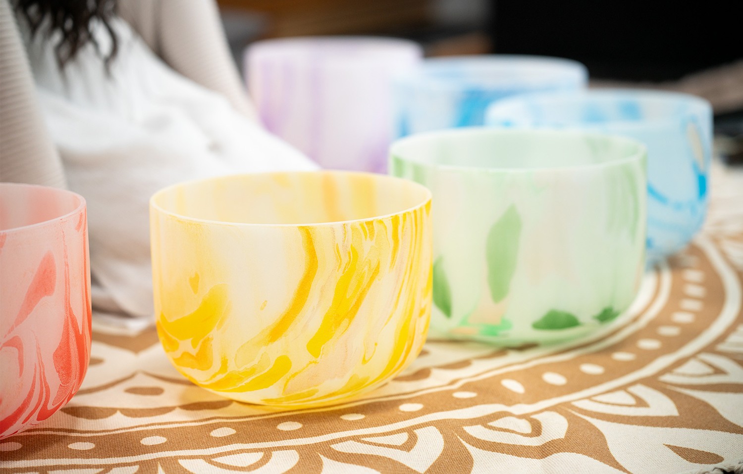 Den vakkert marmorerte fargen på syngebollene orientert mot det respektive matchende chakraet.